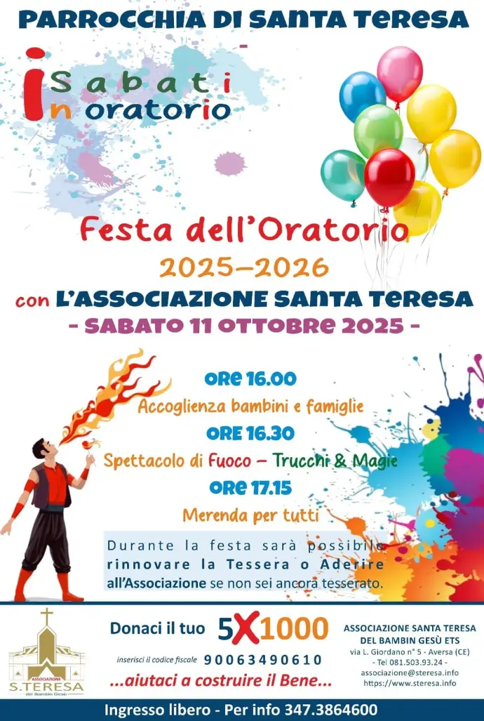 Anche quest’anno l’Associazione Santa Teresa vi invita alla Festa dell’Oratorio 2025/2026, un appuntamento imperdibile per bambini, famiglie e volontari.